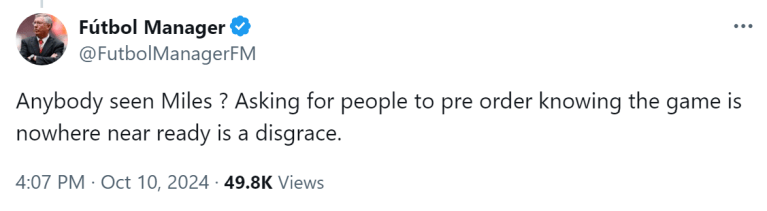 One fan called out Sports Interactive studio director Miles Jacobsen, sarcastically asking, “Anybody seen Miles ? Asking for people to pre-order knowing the game is nowhere near ready is a disgrace.”