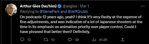 Gies responded giving a better explanation of what he meant, declaring, “On podcasts 12 years ago, yeah? I think it’s very flashy at the expense of fine adjustments, and was indicative of a lot of Japanese shooters at the time in its emphasis on animation priority over player control. Could I have phrased that better then? Definitely.”