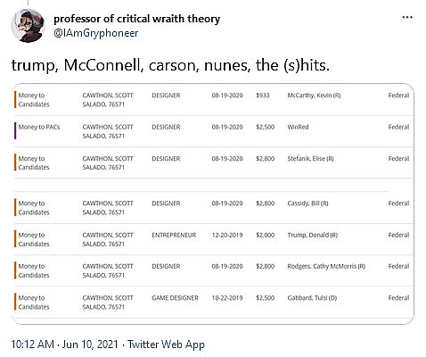 “trump, McConnell, carson, nunes, the (s)***s,” said @IAmGryphoneer of some of the politicians to whom Cawthon made a donation.
