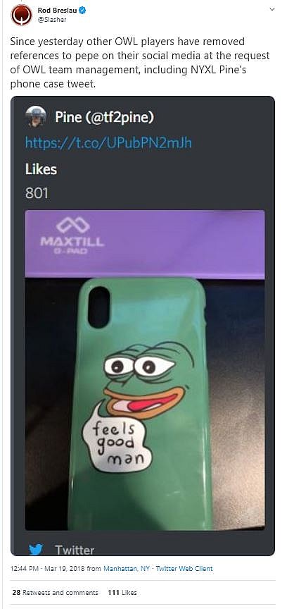 Esports reporter Rod Breslau reported New York Excelsior DPS Kim “Pine” Do-hyeon deleted a photo of his phone case that featured Pepe the Frog.