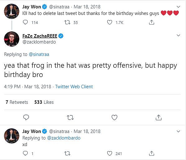 Jay “sinatraa” Won indicated he deleted a Pepe the Frog birthday meme.
