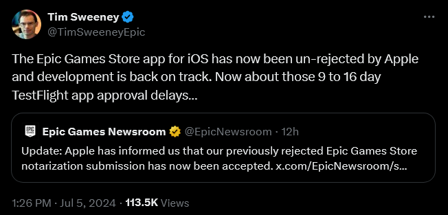 In light of the announcement, Epic Games Founder and CEO Tim Sweeney took to X to rejoice, “The Epic Games Store app for iOS has now been un-rejected by Apple and development is back on track. Now about those 9 to 16 day TestFlight app approval delays…”