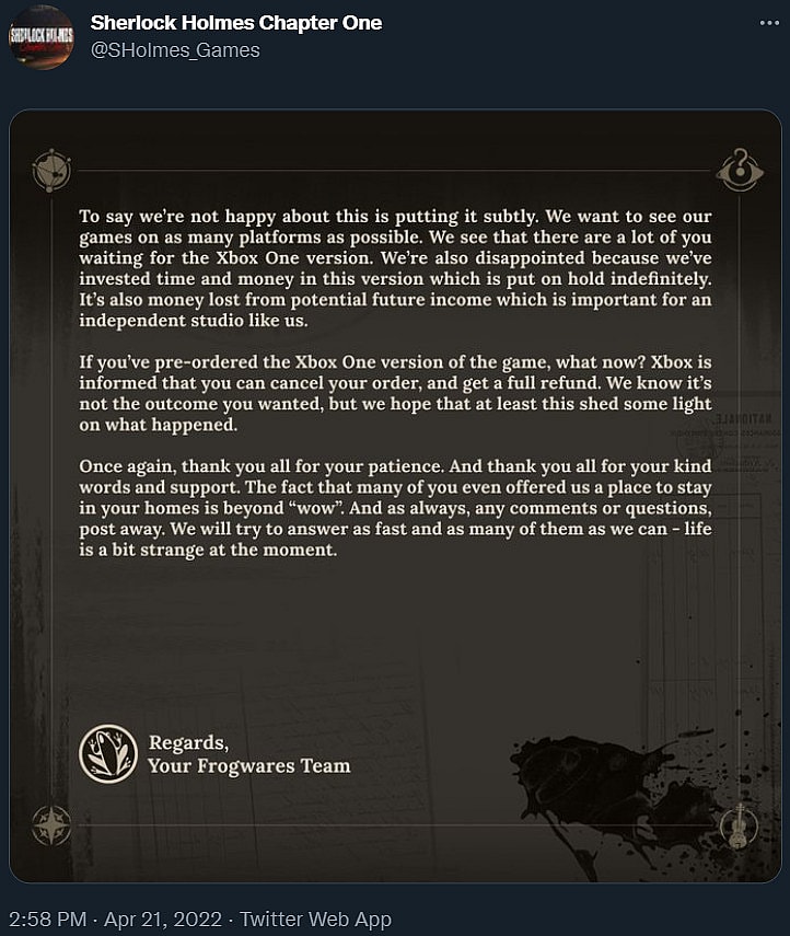 “The good news is that we will be releasing Sherlock Holmes Chapter One on PS4 on the 28th of April 2022,” the developer reassured. “The bad news is that unfortunately, we had to make a tough decision on the Xbox One version of the game.”