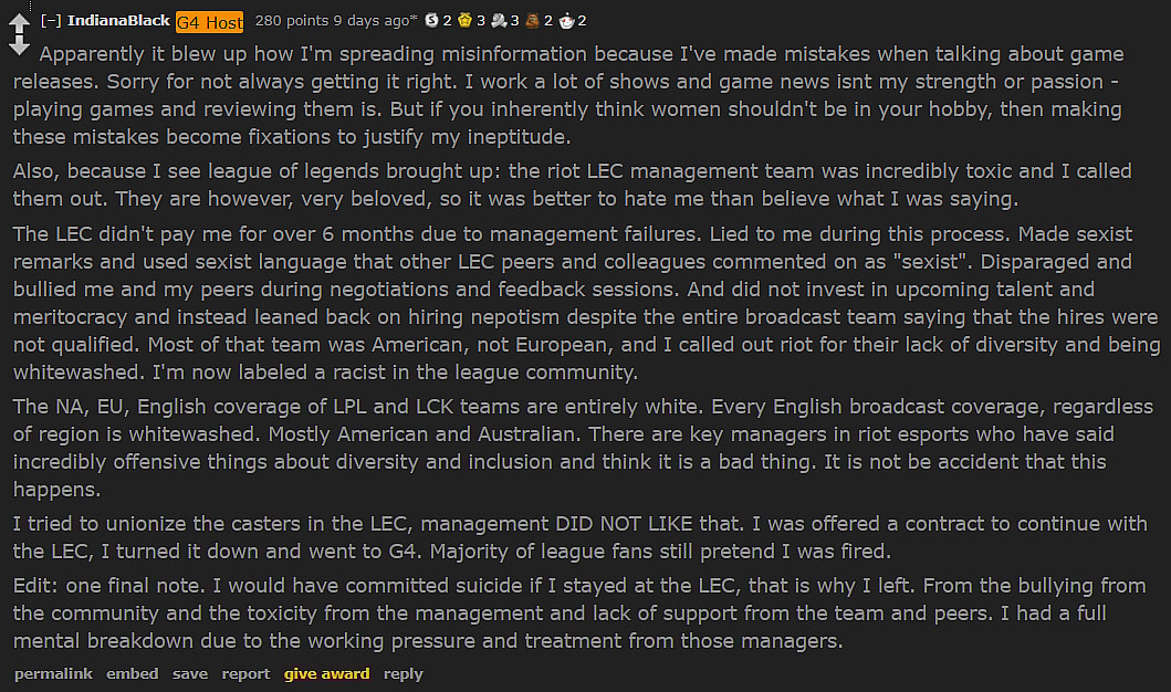 Noting that “league of legends [was] brought up,” Black rounded out her response by accusing the League of Legends European Championship of perpetuating rampant racism and sexism during her time with the organization, taking issue with such occurrences as English-language broadcasts of events being hosted by white people and “key managers in riot esports [saying] incredibly offensive things about diversity and inclusion and [thinking] it is a bad thing.”