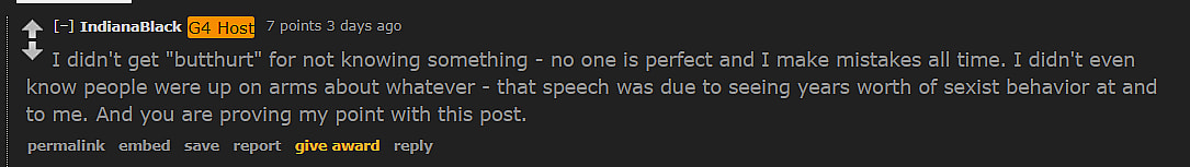 “I didn’t get ‘butthurt’ for not knowing something – no one is perfect and I make mistakes all time,” replied Black. “I didn’t even know people were up on arms about whatever – that speech was due to seeing years worth of sexist behavior at and to me. And you are proving my point with this post.”