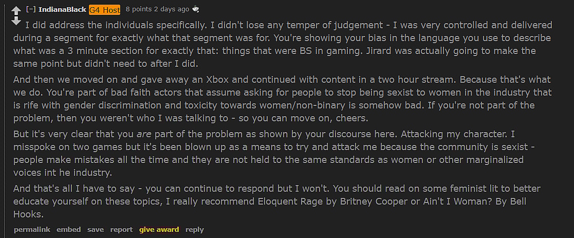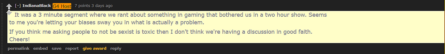 Again refusing to play into Black’s attempt to paint him as a bigot, /u/Sean_Finnegan told the G4 host once more, “I am holding you to standards that are genderless. As I stated, I don’t care about your gender at all. I judge you on your words and actions alone.”