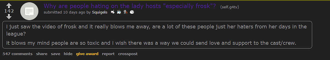 In the wake of the episodes airing and the subsequent spread of Black’s rant across social media, one viewer on Reddit, /u/Squigels, took to the /r/G4TV subreddit to post a thread inquiring as to “Why are people hating on the lady hosts ‘especially frosk’?”