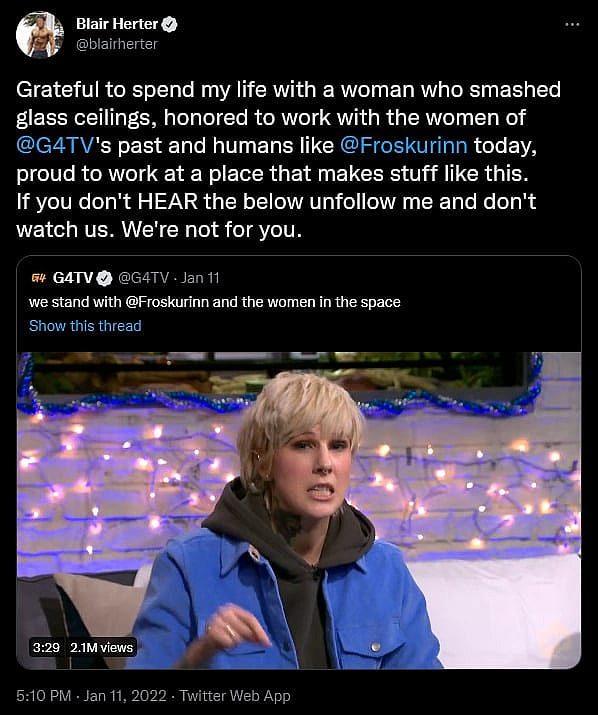 “Grateful to spend my life with a woman who smashed glass ceilings, honored to work with the women of @G4TV’s past and humans like @Froskurinn today, proud to work at a place that makes stuff like this,” wrote Herter on January 12th, retweeting G4’s clip of Frosk’s attack against her audience. “If you don’t HEAR the below unfollow me and don’t watch us. We’re not for you.”