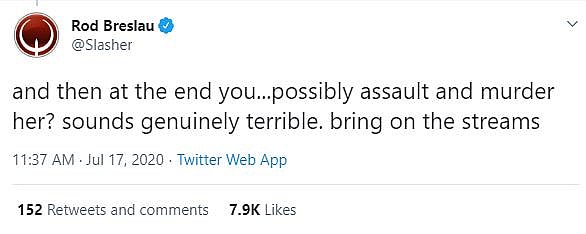 In a subsequent tweet he would speculate about the game’s ending, “and then at the end you…possibly assault and murder her? sounds genuinely terrible. bring on the streams.”