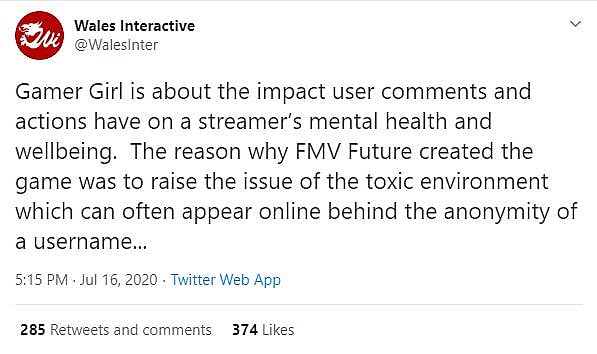 They wrote on Twitter, “Gamer Girl is about the impact user comments and actions have on a streamer’s mental health and wellbeing. The reason why FMV Future created the game was to raise the issue of the toxic environment which can often appear online behind the anonymity of a username…”