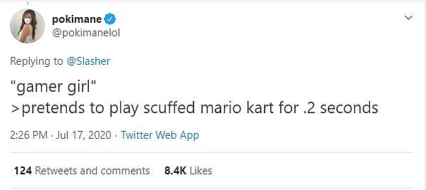 Twitch streamer Pokimane would also get in on the action. She initially responded to Breslau writing, “‘gamer girl’ >pretends to play scuffed mario kart of .2 seconds.”