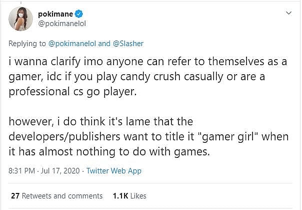 She then added, “I wanna clarify imo anyone can refer to themselves as a gamer, idc if you play candy crush casually or are a professional cs go player.”