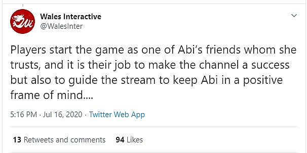 They elaborated, “Players start the game as one of Abi’s friends whom she trusts, and it is their job to make the channel a success but also to guide the stream to keep Abi in a positive frame of mind….”