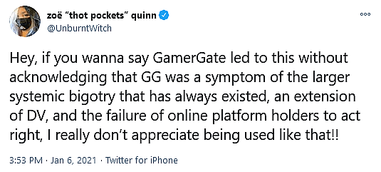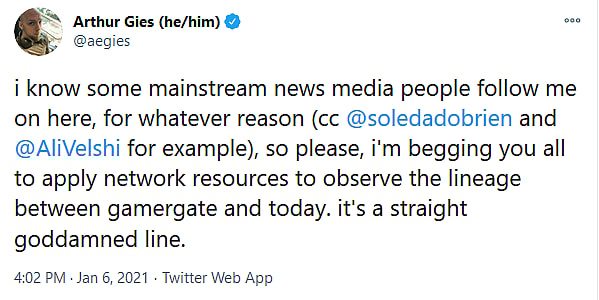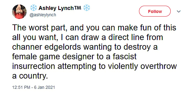 Similarly to Gies, outspoken GamerGate critic Ashley Lynch wrote that she could “draw a direct line from channer edgelords wanting to destroy a female game designer to a fascist insurrection attempting to violently overthrow a country.”