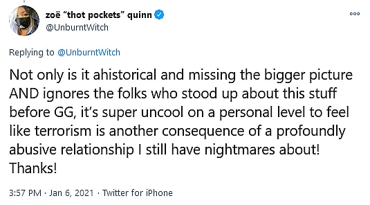 She further explained that she believed such a misrepresentation to be “ahistorical and missing the bigger picture AND ignores the folks who stood up about this stuff before GG.”