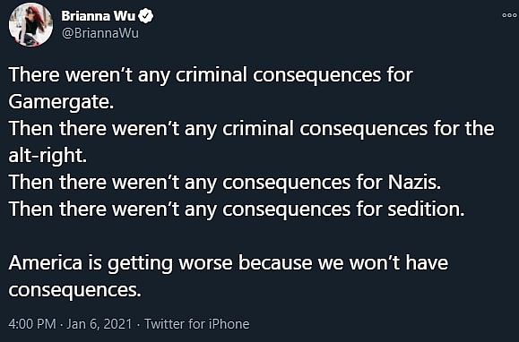 Former congressional candidate and Revolution 60 developer Brianna Wu, who has previously blamed GamerGate for everything from mass shootings to the election of President Donald Trump, claimed that the events at the U.S. Capitol unfolded because “there weren’t any criminal consequences for Gamergate.”