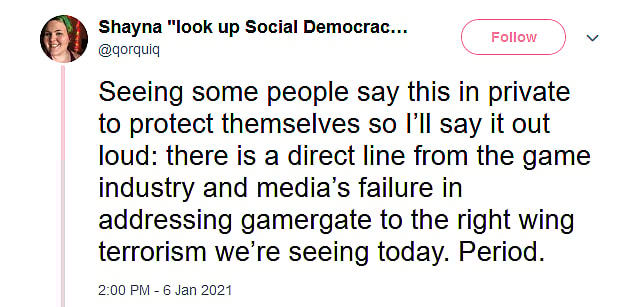 “Seeing some people say this in private to protect themselves so I’ll say it out loud: there is a direct line from the game industry and media’s failure in addressing gamergate to the right wing terrorism we’re seeing today. Period.” argued God of War (2018) producer Shayna Moon.