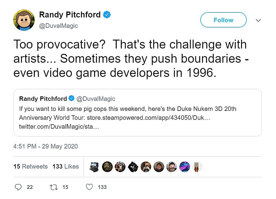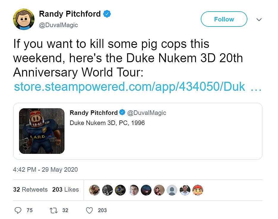 In a subsequent tweet that he has since deleted, Pitchford wrote, “If you want to kill some pig cops this weekend, here’s the Duke Nukem 3D 20th Anniversary World Tour.”