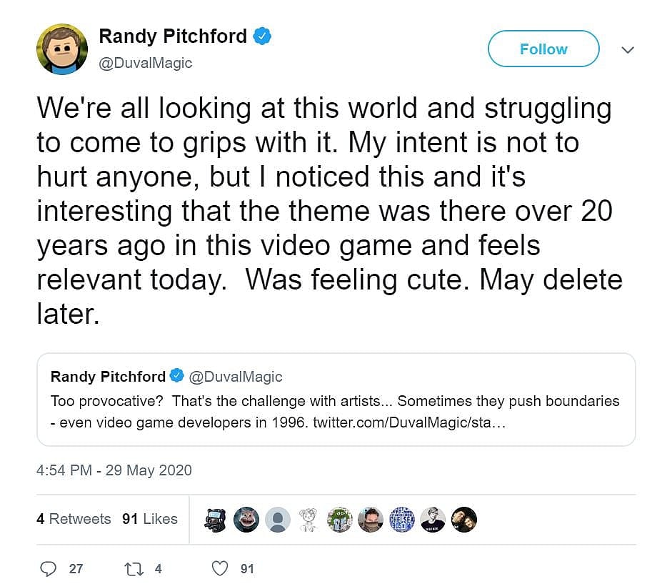 Then in another deleted tweet he wrote, “We’re all looking at this world and struggling to come to grips with it. My intent is not to hurt anyone, but I noticed this and it’s interesting that the theme was there over 20 years ago in this video game and feels relevant today.”