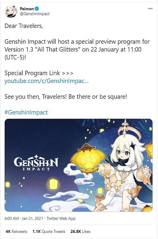 They wrote on Twitter, “Dear Travelers, Genshin Impact will host a special preview program on Version 1.3 “All That Glitters” on 22 January at 11:00 (UTC-5)!