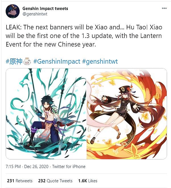 The Twitter account wrote, “LEAK: The next banners will be Xiao and… Hu Tao! Xiao will be the first one of the 1.3 update, with the Lantern Event for the new Chinese year.”