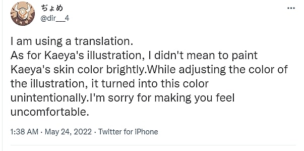 “I didn’t mean to paint Kaeya’s skin color brightly,” wrote the artist in English via the use of a machine translator. “While adjusting the color of the illustration, it turned into this color unintentionally. I’m sorry for making you feel uncomfortable.”