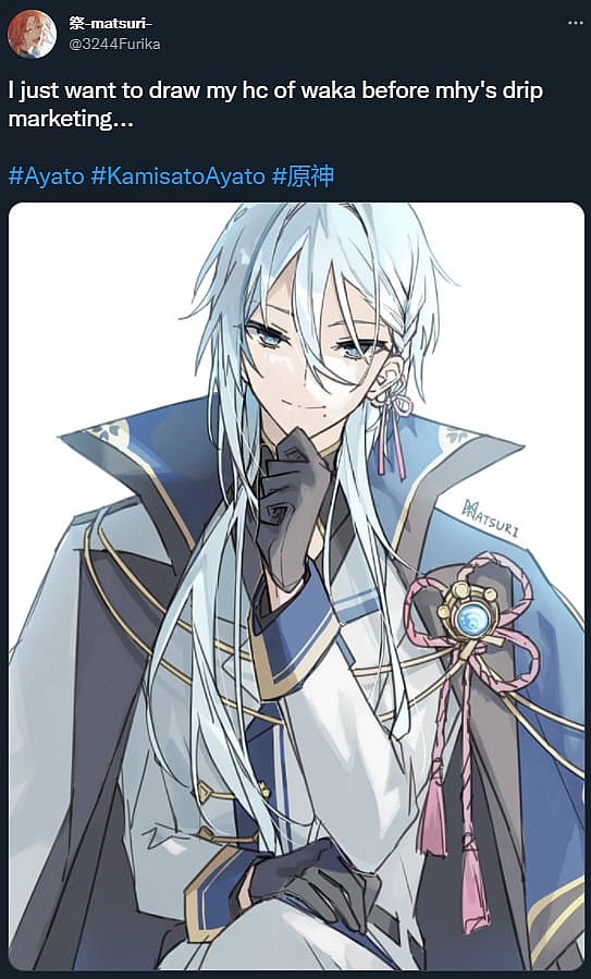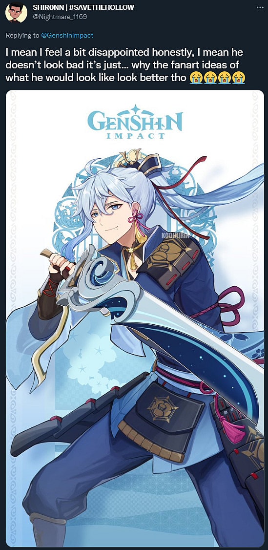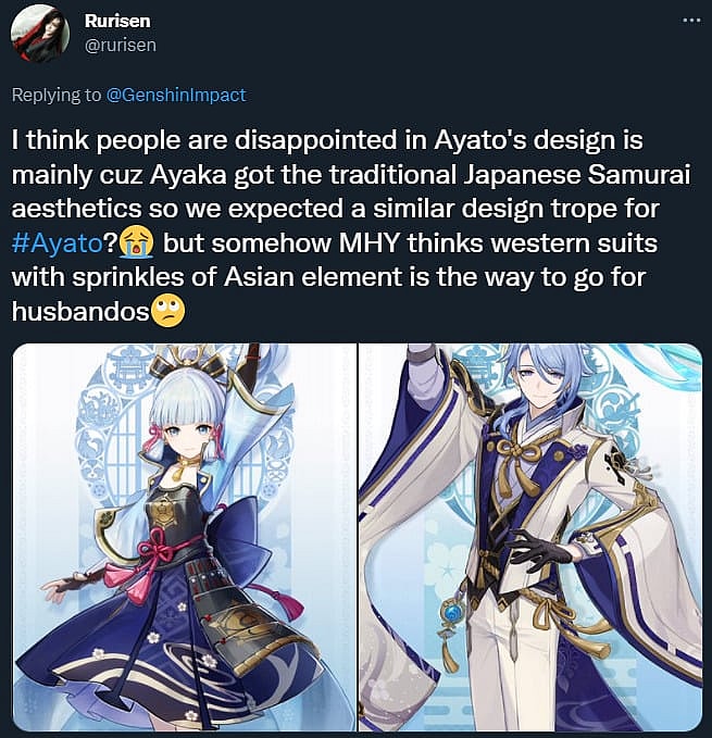 “I think people are disappointed in Ayato’s design is mainly cuz Ayaka got the traditional Japanese Samurai aesthetics so we expected a similar design trope for #Ayato?” Rurisen tweeted, “but somehow MHY thinks western suits with sprinkles of Asian element is the way to go for husbandos.”
