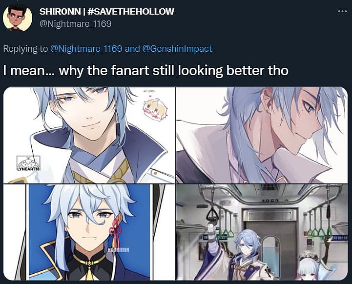 He continued, “I mean… why the fanart still looking better tho,” highlighting several pieces of fan-art that made Ayato look somewhat more mature, as well as an edited image of Ayato riding a subway train with Ayaka.