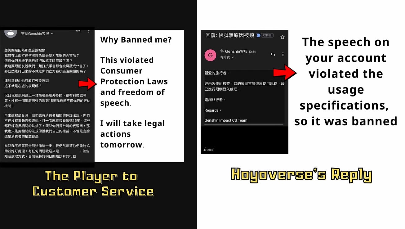 The user then wrote to the game’s customer service, calling out Genshin Impact for censoring certain words and phrases and arguing that that their lengthy banning with no prior warning violated the consumer protection laws and regulations of his resident country, Taiwan.