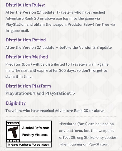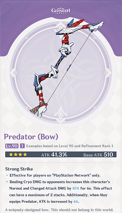 miHoYo concluded their announcement by clarifying that while “Predator (Bow) can be used on any platform”, its effect, Strong Strike, will only apply “when playing on PlayStation.”