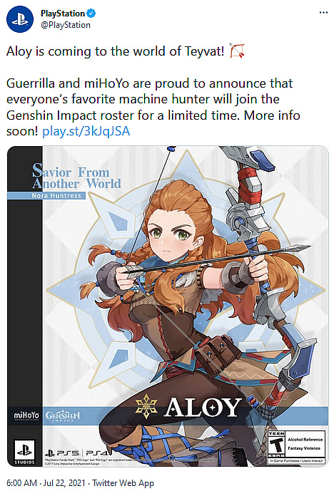 In a tweet published to the official PlayStation Twitter account on July 22nd, Guerilla Games and miHoYo surprise revealed that they were “proud to announce that everyone’s favorite machine hunter will join the Genshin Impact roster for a limited time.”