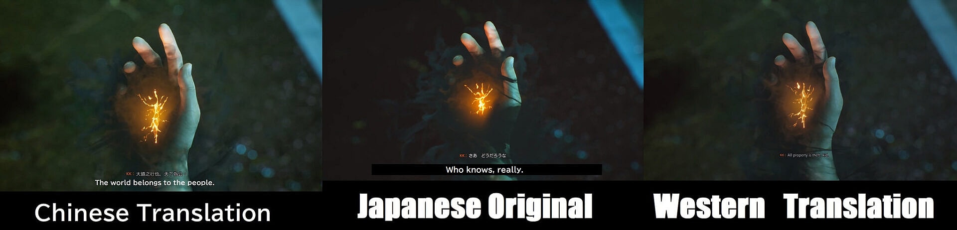 While the English line could be taken as sarcasm or a wry excuse, many took the phrase to be a case of English localizers forcing their political beliefs into the game’s translation.
