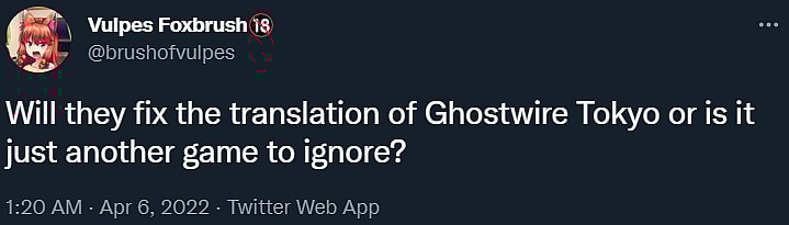 “Will they fix the translation of Ghostwire Tokyo or is it just another game to ignore?” asked @brushofvulpes.