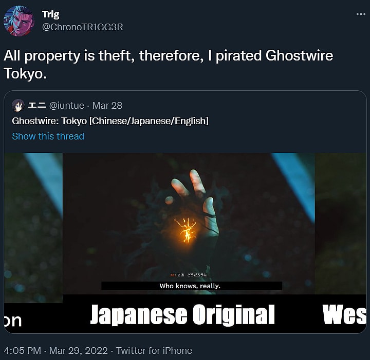 “All property is theft, therefore, I pirated Ghostwire Tokyo,” mocked @ChronoTR1GG3R, suggesting a lost consumer one way or another.