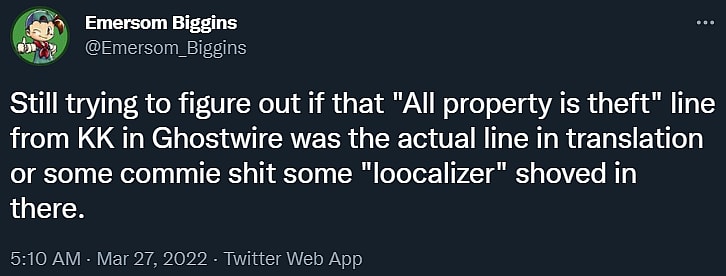 @Emersom_Biggins queried, “Still trying to figure out if that ‘All property is theft’ line from KK in Ghostwire was the actual line in translation or some commie s–t some ‘loocalizer’ shoved in there”