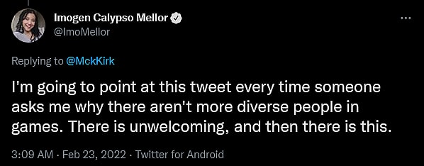 Taking note of McKeand’s initial tweet, PC Gamer features producer Imogen Mellor asserted, “I’m going to point at this tweet every time someone asks me why there aren’t more diverse people in games. There is unwelcoming, and then there is this.”