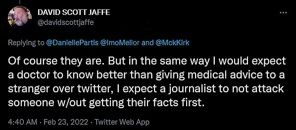 “Of course they are,” said Jaffe. “But in the same way I would expect a doctor to know better than giving medical advice to a stranger over twitter, I expect a journalist to not attack someone w/out getting their facts first.”
