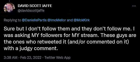“Sure but I don’t follow them and they don’t follow me,” said the video game designer-turned YouTuber. “I was asking MY followers for MY stream. These guys are the ones who retweeted it (and/or commented on it) with a judgy comment.”