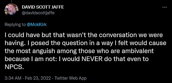“I could have but that wasn’t the conversation we were having,” countered Jaffe. “I posed the question in a way I felt would cause the most anguish among those who are ambivalent because I am not: I would NEVER do that even to NPCS.”