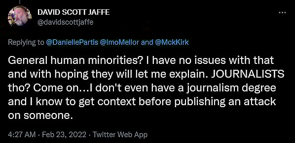 “General human minorities? I have no issues with that and with hoping they will let me explain,” Jaffe elaborated. “JOURNALISTS tho? Come on…I don’t even have a journalism degree and I know to get context before publishing an attack on someone.”