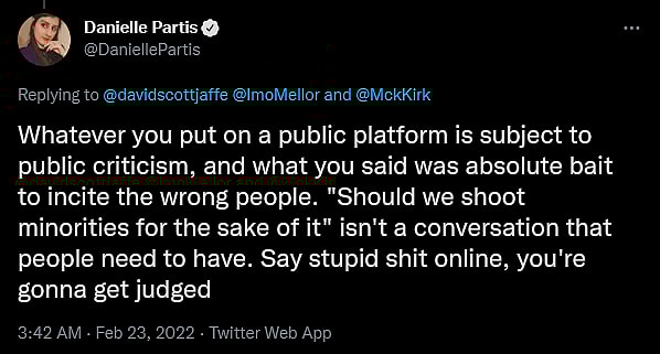 “Whatever you put on a public platform is subject to public criticism, and what you said was absolute bait to incite the wrong people,” she replied. “‘Should we shoot minorities for the sake of it’ isn’t a conversation that people need to have. Say stupid s–t online, you’re gonna get judged.”