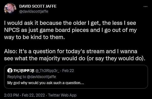 Asked near immediately by numerous fans why he would make such an inquiry, much less in a way that referenced both the Pulse nightclub shooting and general hateful rhetoric, Jaffe explained, “I would ask it because the older I get, the less I see NPCS as just game board pieces and I go out of my way to be kind to them.”