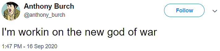 While Burch has not appeared on the game’s IMDB page at this time of writing, Burch had previously stated “I’m workin on the new god of war” in a now deleted September 2020 tweet.