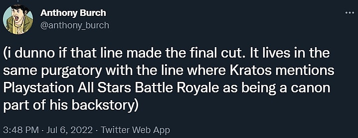 “I dunno if that line made the final cut,” Burch admits. “It lives in the same purgatory with the line where Kratos mentions Playstation All Stars Battle Royale as being a canon part of his backstory.”