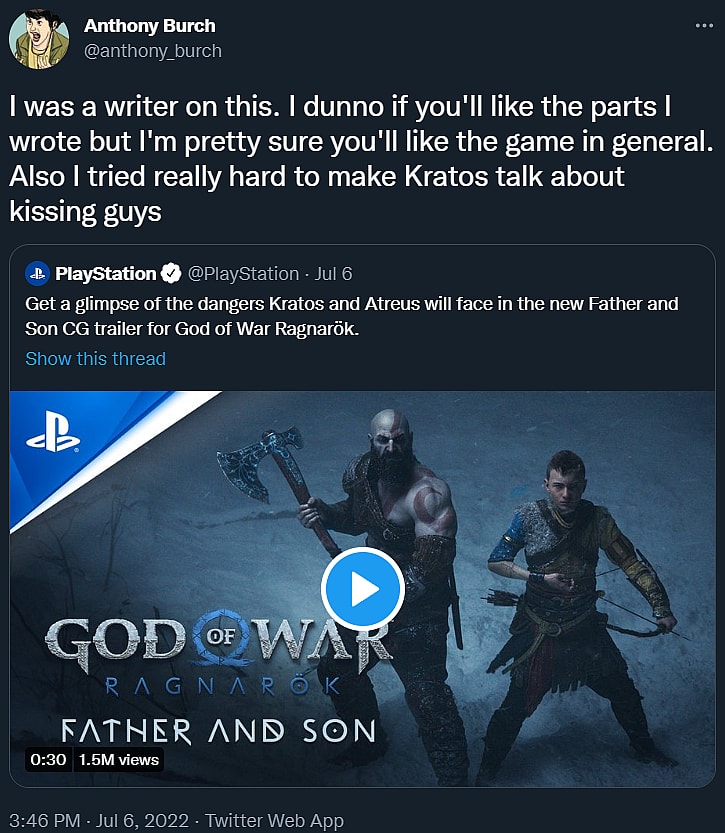 Burch’s claim came July 6th, shortly after God of War Ragnarök’s release date was announced. Quote retweeting the announcement, Burch added “I was a writer on this. I dunno if you’ll like the parts I wrote but I’m pretty sure you’ll like the game in general. Also I tried really hard to make Kratos talk about kissing guys.”