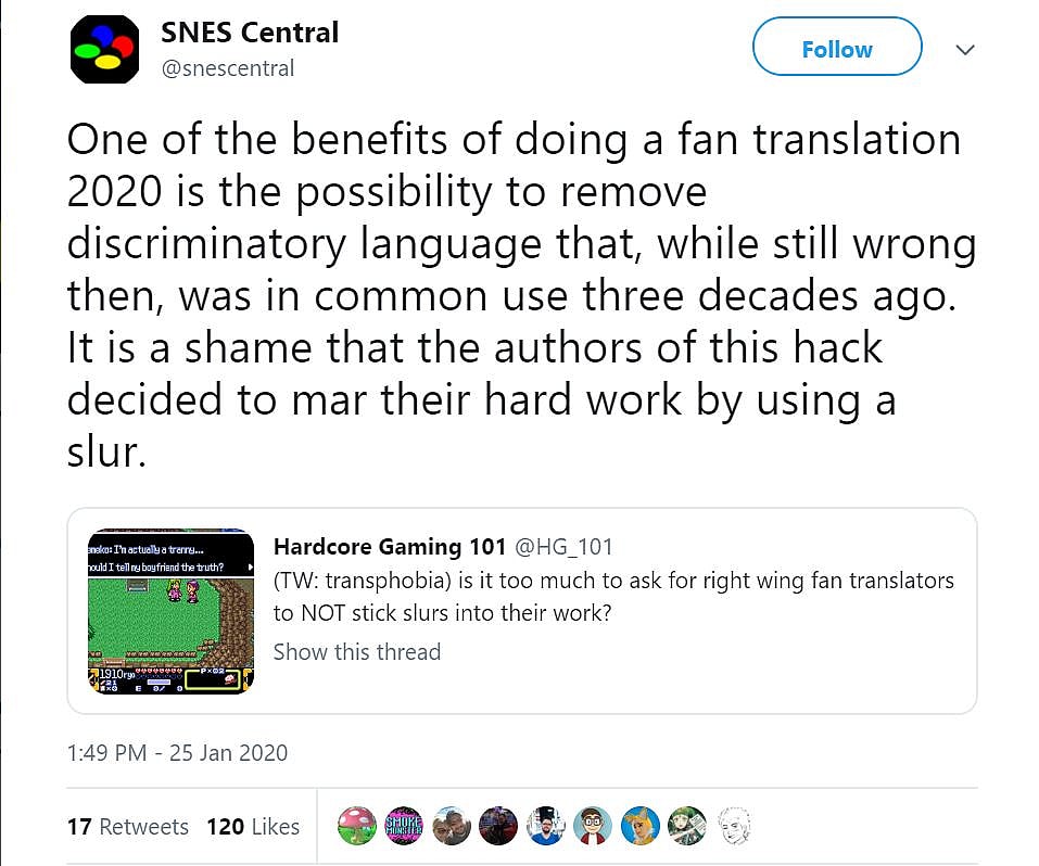 Soon after the release of the ROM hack, some social media users took note of one particular line of dialogue, encountered when the player talks to an NPC named Kemeko who asks the player how she should reveal to her boyfriend that she is a “tranny.”