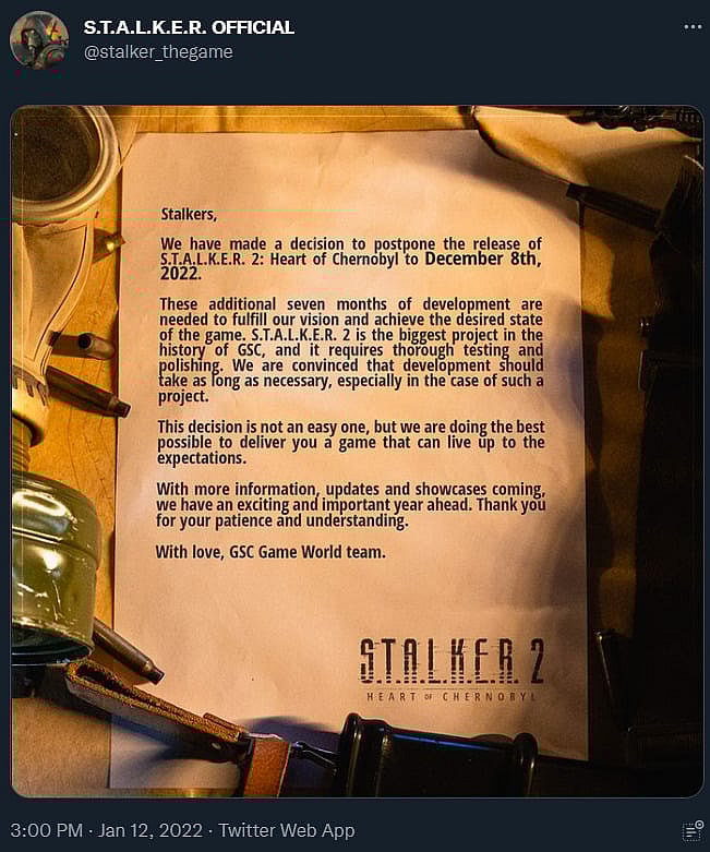 “Stalkers,” begins a statement shared by GSC Game World to the title’s official Twitter. “We have made a decision to postpone the release of S.T.A.L.K.E.R. 2: Heart of Chernobyl to December 8th, 2022.”
