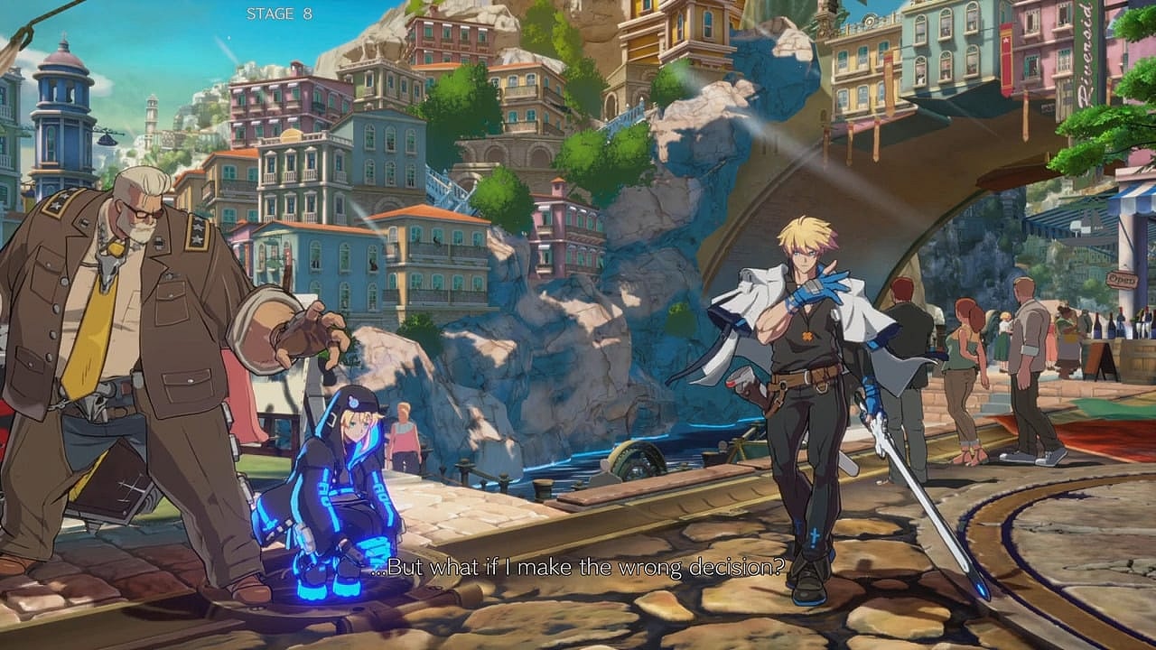 “This is where the Arcade Mode story begins,” he asserted. “After her exchanges with Goldlewis and Ky, Bridget faces parts of herself she has tried to ignore, and makes a big decision for herself.”