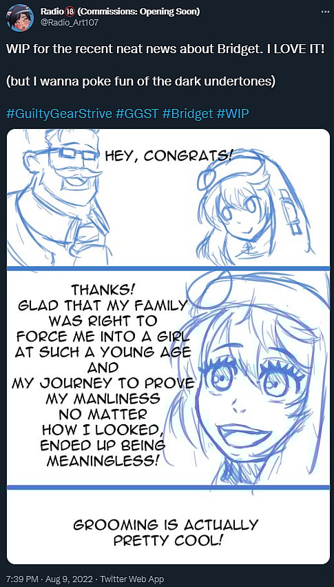 Artist @Radio_Art107 (reader discretion is advised) further illustrated the point with their comic. After Bridget is congratulated he states “Thanks! Glad that my family was right to force me into a girl at such a young age and my journey to prove my manliness no matter how I looked, ended up being meaningless!” The comic ends with the caption “Grooming is actually pretty cool!”