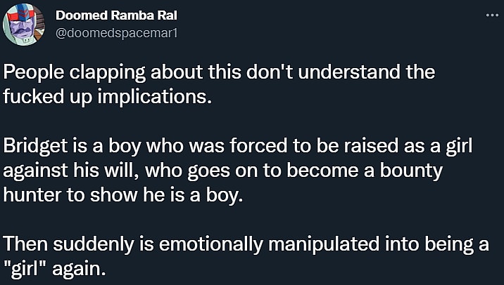Others highlighted their surprise that greater picture for Bridget’s character arc didn’t cause offense. “People clapping about this don’t understand the f—ked up implications,” @doomedspacemar1 explained. “Bridget is a boy who was forced to be raised as a girl against his will, who goes on to become a bounty hunter to show he is a boy. Then suddenly is emotionally manipulated into being a ‘girl’ again.”